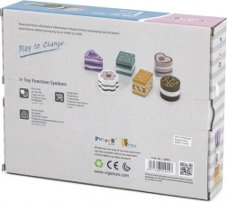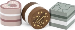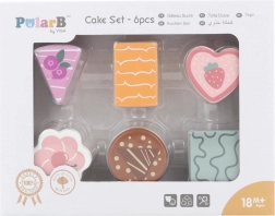 Ta set vsebuje šest lepo izdelanih lesenih priboljškov različnih oblik in barv – rezine torte, krog, srček ali prizmatični kos. Otroci se lahko igrajo slaščičarno, postrežejo medvedku ali pripravijo čajanko. Vsak kos dobro sede v otroško roko in vabi k ponavljajoči se igri.