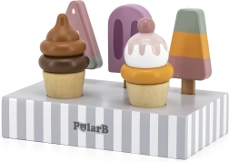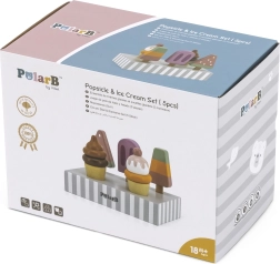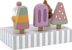 Set 5 lesenih sladoledov v privlačnih barvah prinaša otrokom neomejeno mero zabave. Sladoledi so postavljeni na stabilnem lesenem stojalu, ki služi tako za razstavljanje kot za pregledno shranjevanje. Vse je izdelano iz kakovostnega lesa in barvano z varnimi, netoksičnimi barvami.