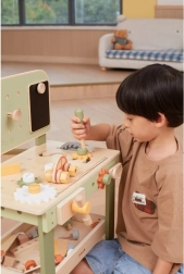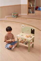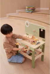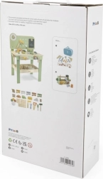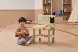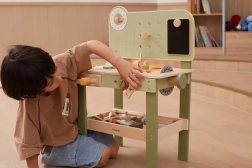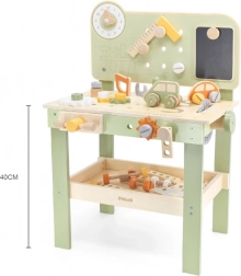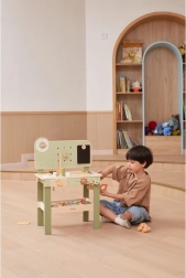 Stilna otroška delovna klop v naravno–zelenem videzu ponuja realističen občutek delavnice v varni, leseni obliki. Otroci lahko privijajo, menjajo kolesca na avtiču, »žagajo« delčke, sestavljajo zobnike in odkrivajo principe vzroka in posledice. Zahvaljujoč preglednemu shranjevalnemu prostoru bodo vsi deli in orodje vedno pri roki.