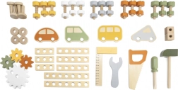 Igra z delovno klopjo spodbuja fino motoriko, koordinacijo roka–oko, logično razmišljanje in kreativnost. Lesena izvedba je trpežna in prijetna na dotik, zato je primerna za vsakodnevno igro doma in v vrtcu.