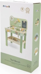 Odkrijte kakovostno leseno delovno klop za otroke iz ekskluzivne serije POLARB znamke VIGA. Mali mojstri lahko zabijajo žeblje, zategujejo vijake z ključem, pritrjujejo ploščice in zobnike ter na igriv način urijo fino motoriko. Del kompleta so tudi ure z kazalci, leseni avtič, praktična polica za orodje in tabla za risanje za še več zabave.