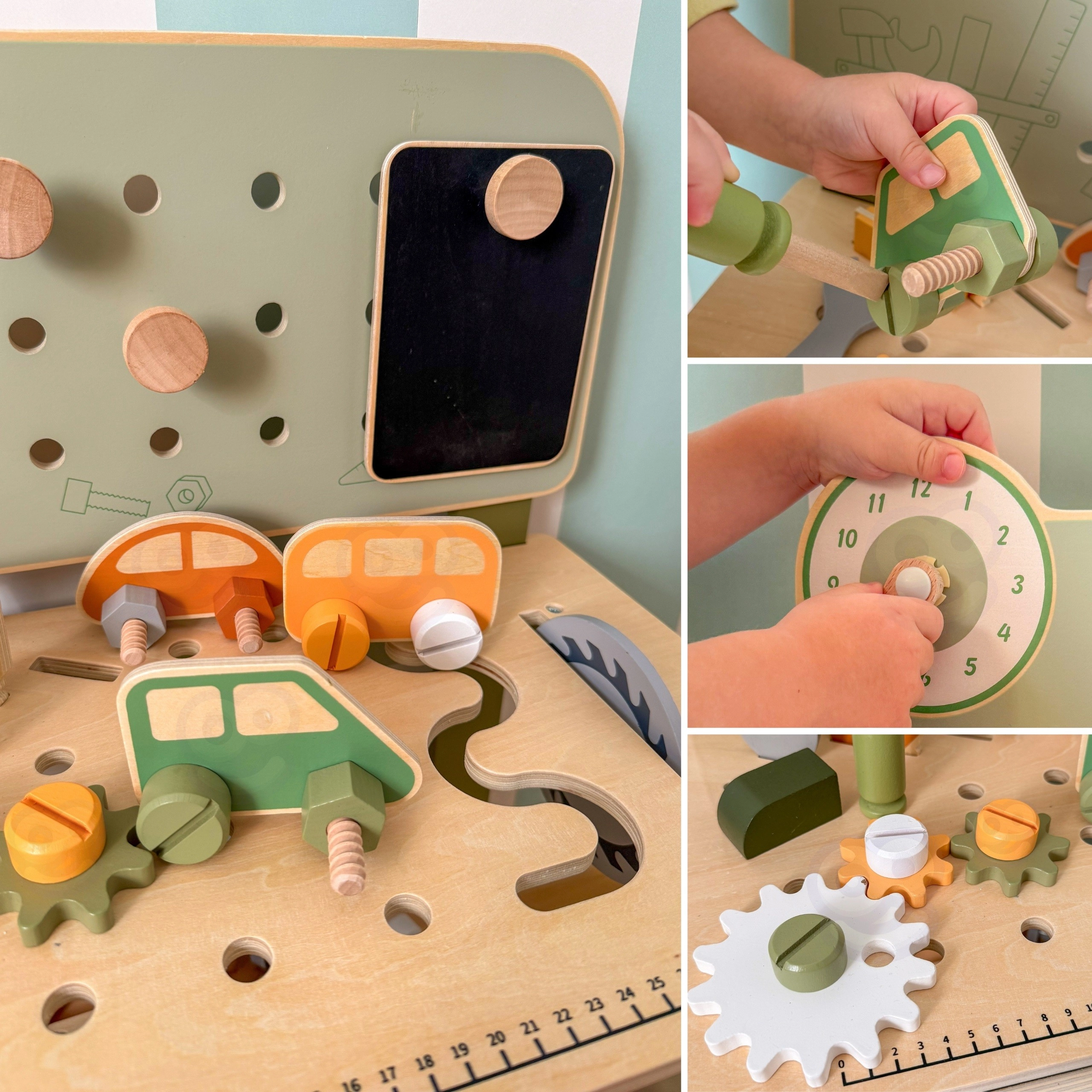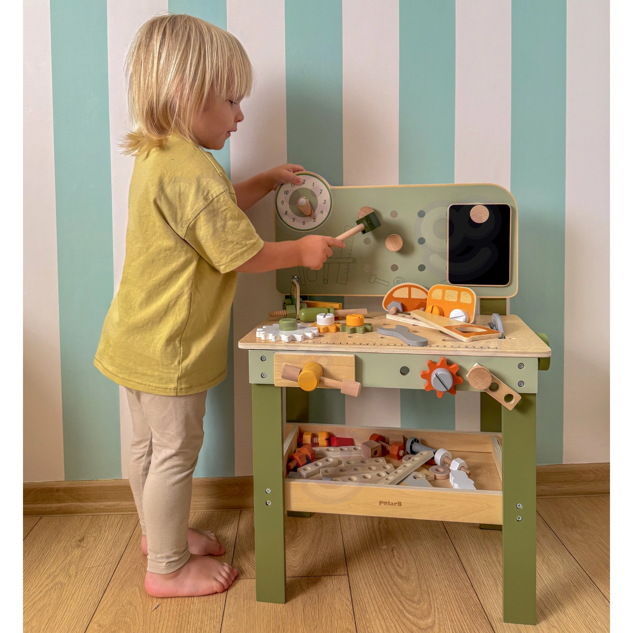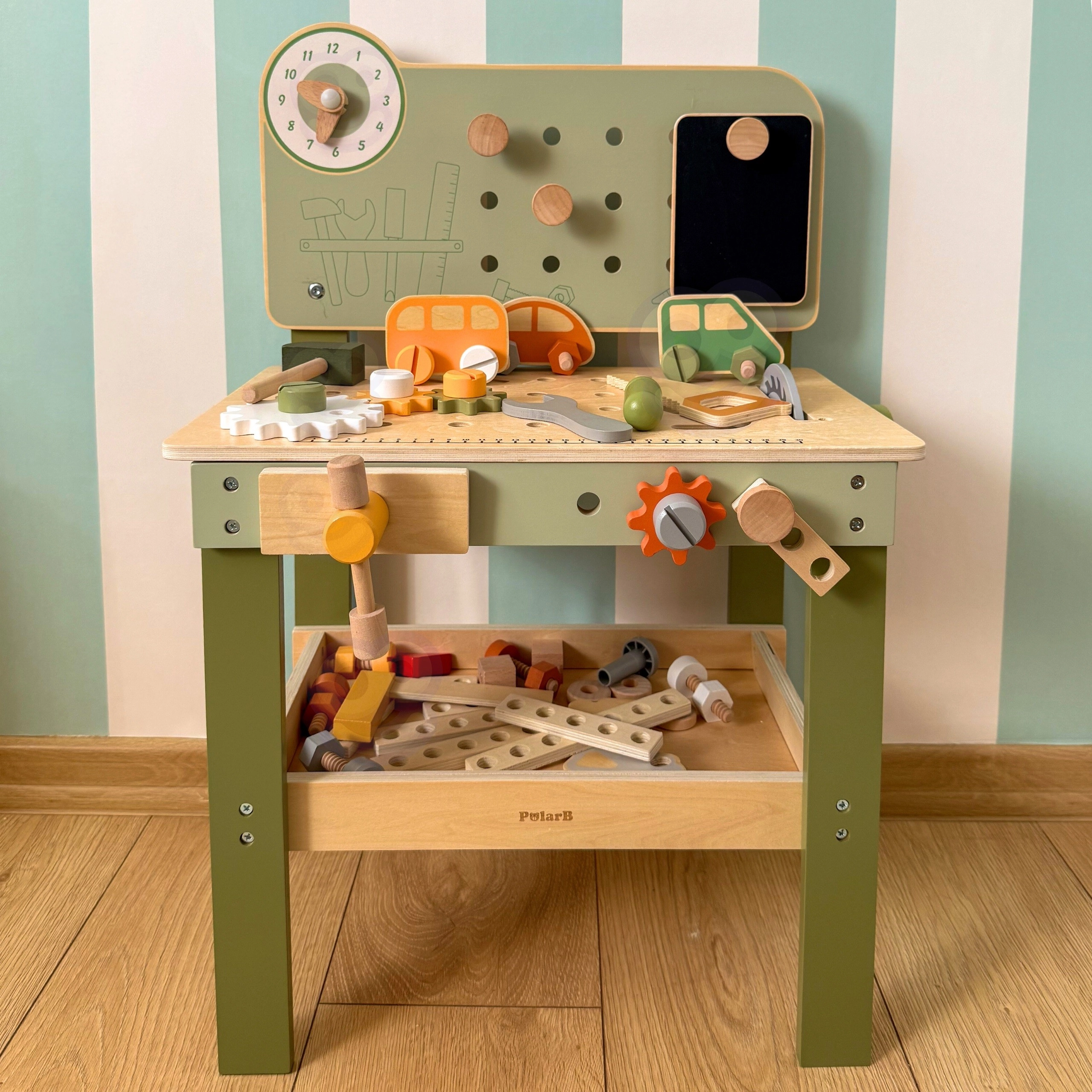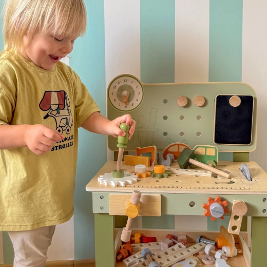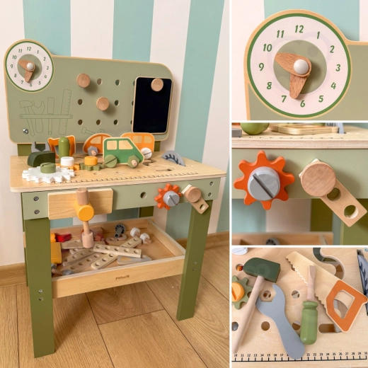 Pult s pegboardom, mersko lestvico in vrtljivimi elementi spodbuja realistično igro ter razvoj spretnosti pri delu z orodjem.