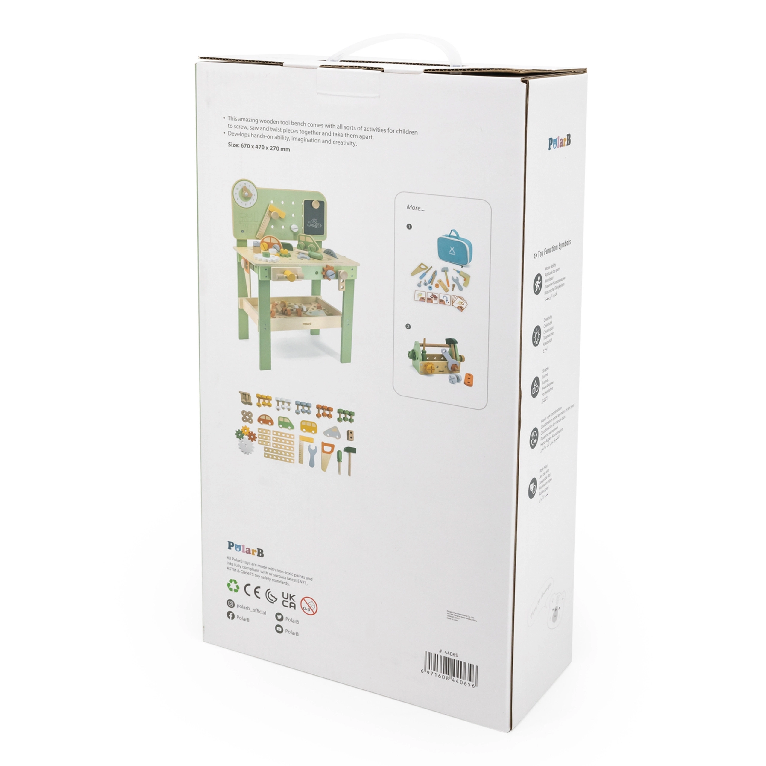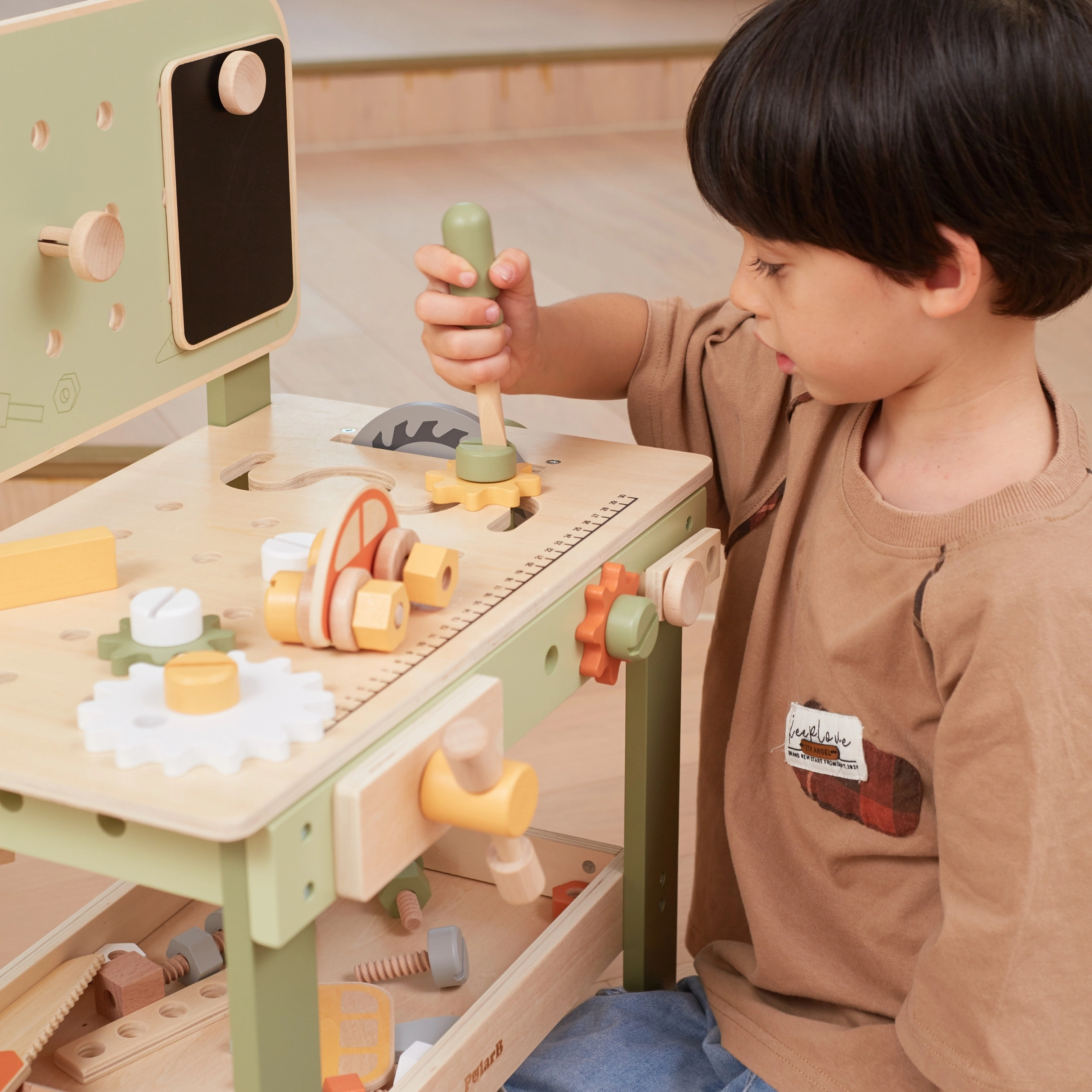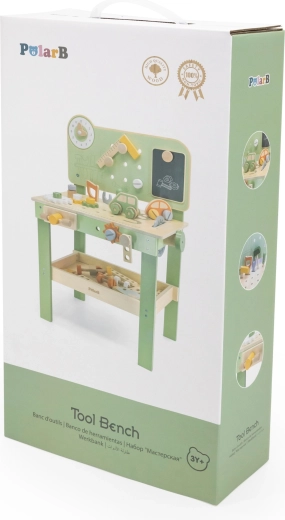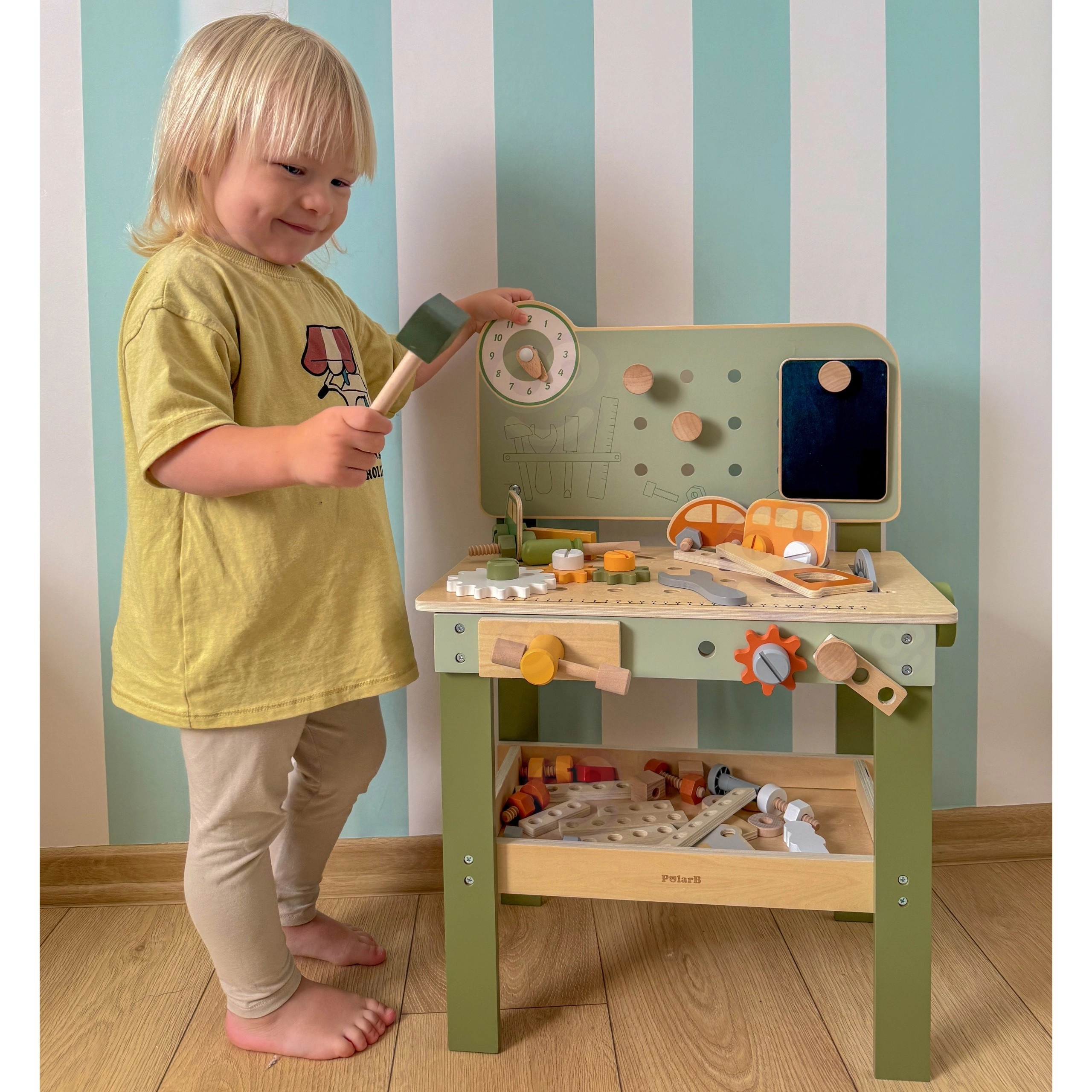 Pult s pegboardom, mersko lestvico in vrtljivimi elementi spodbuja realistično igro ter razvoj spretnosti pri delu z orodjem.