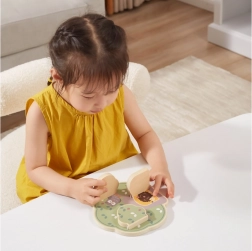 Zaradi kakovostnega lesa in gladke obdelave je igra varna za male ročice. Barvite ilustracije motivirajo k ponavljajoči se igri ter pomagajo pri prepoznavanju barv in oblik. Odlična izbira za prvo izobraževalno igračo v otroški sobi.