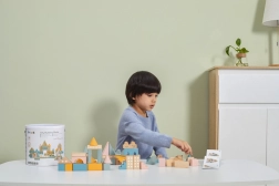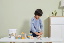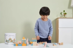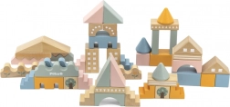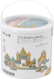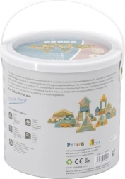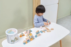Ta kakovostna lesena sestavljanka v vedru ponuja 50 skrbno izdelanih kosov v prijetnih pastelnih barvah. Otroci lahko z njo zgradijo hišice, stolpiče in celo mesto, hkrati pa razvijajo koordinacijo, logično razmišljanje in kreativnost.