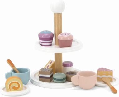Elegantno dvonadstropno stojalo sprejme vse tortice in ustvari realistično sceno za čajni popoldan. Otroci se igrivo urijo v finej motoriki pri aranžiranju.