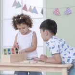 Igrača uči otroke pravilnega ločevanja odpadkov z uporabo igrivih lesenih ploščic in barvno označenih košev.