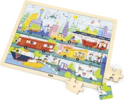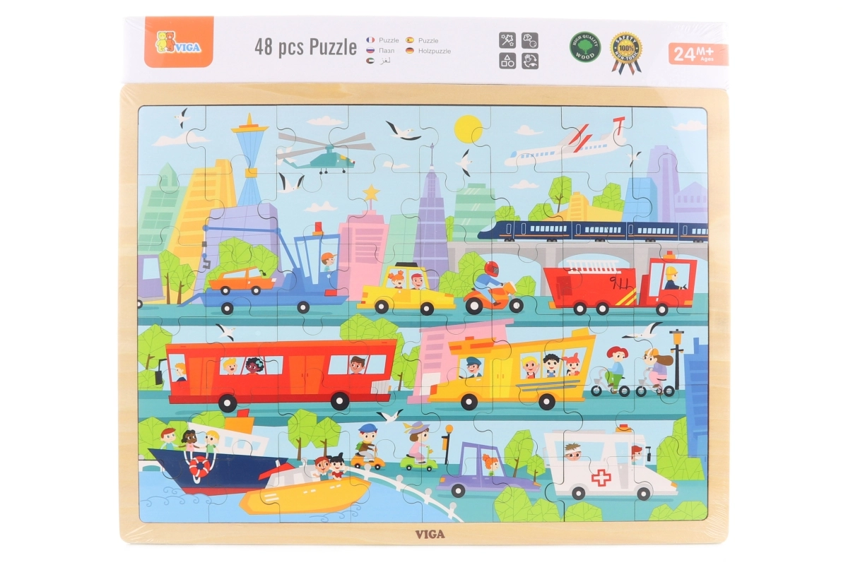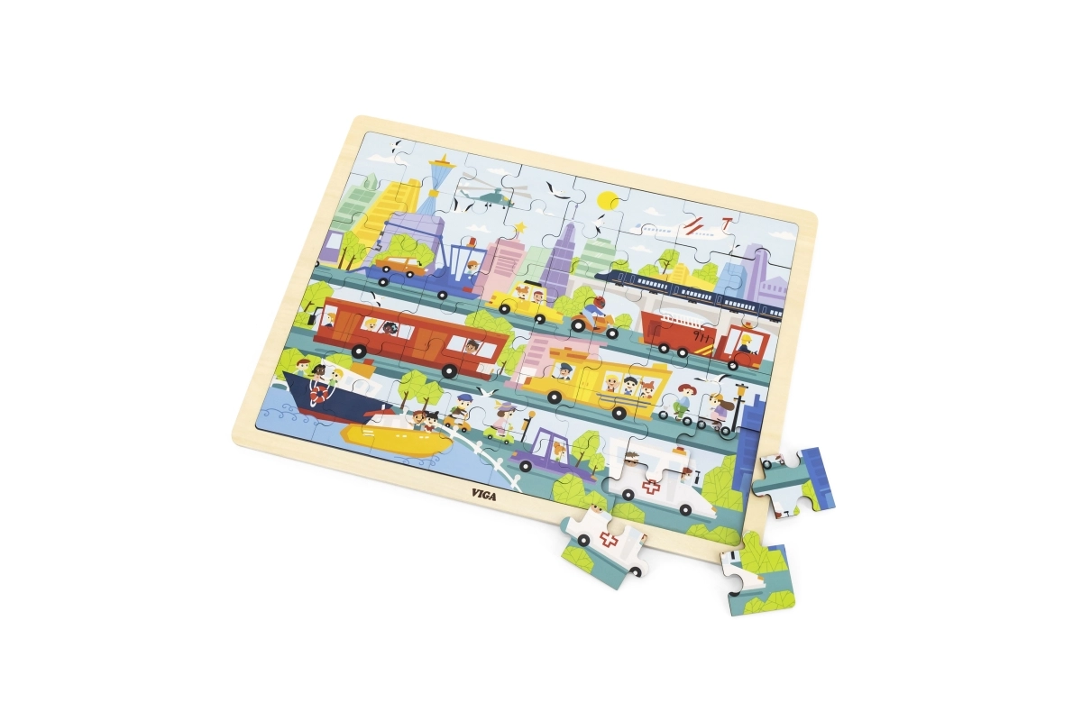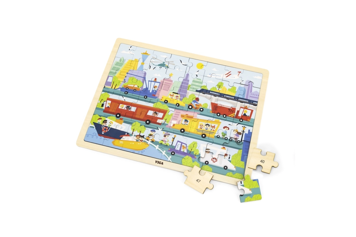 Ta kakovostna lesena sestavljanka s pisano mestno sceno in prevoznimi sredstvi bo navdušila male raziskovalce. S 48 koščki in trdnim okvirjem si otroci urijo koncentracijo, koordinacijo oko–roka in potrpežljivost. Jasne barve in razumljive ilustracije spodbujajo k ponovnemu sestavljanju.