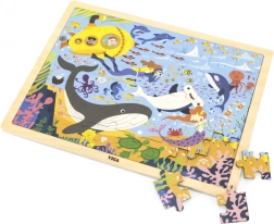 Z lesenimi sestavljankami Morsko življenje boste odkrili osupljivo paleto morskih živali, kot so kiti in ribice, vse skupaj vključno z rumeno podmornico.