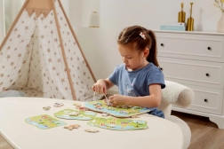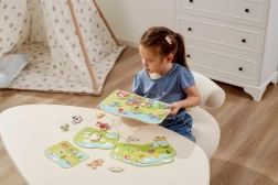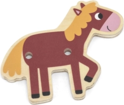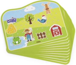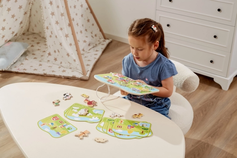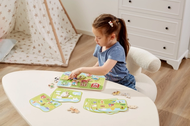 Ta prepletalni set s tematiko kmetije je idealen pripomoček za razvoj spretnosti predšolskih otrok. Otroci po predlogah ali po lastni domišljiji prepletajo vrvice skozi barvite lesene koščke, s čimer krepijo prste, izboljšujejo prijem ter se pripravljajo na pisanje in risanje.