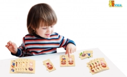 Komplet podpira zgodnji razvoj čutov in fine motorike. Barvite ilustracije spodbujajo k ponovnemu igranju.