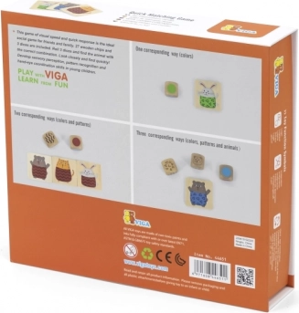 Lesena igra hitro ujemanje znamke VIGA je družabna igra za vso družino, ki uri opazovanje, logiko in spomin. Igralci mečejo 1–3 kocke in iščejo pravo žival s pripadajočim vzorcem na majici in barvo. Izdelano iz kakovostnega lesa in barvano z netoksičnimi barvami – varno za otroke.