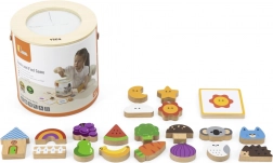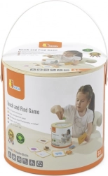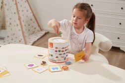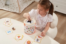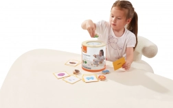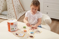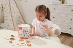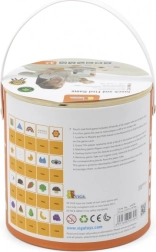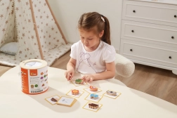 Igra Ujemi in najdi. Pakiranje vsebuje 20 kock, papirnato vedro, 20 igralnih kart in pokrov. Dimenzije pakiranja približno 16 × 15,5 cm. Starost 3+