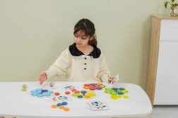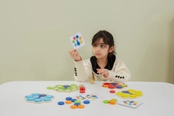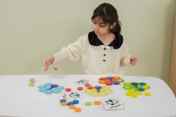 Otroci ujemajo žetone po kartah ali po metu kocke, naravno usvajajo barve ter vadijo pozornost in logiko.