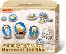 Ta ustvarjalni komplet omogoča otrokom in odraslim, da ustvarijo čudovite kamnčke z motivi Jezusovega rojstva. Dovolj je, da kamnčke operete, osušite in s prenosnimi nalepkami nanje preprosto prenesete slike. Zaradi preprostega postopka je ustvarjanje hitro in zabavno – končani kamnčki služijo za pripovedovanje zgodb, kot dekoracija ali kot prijetno darilo.
