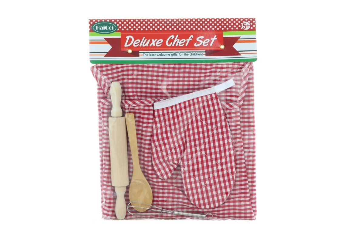 Komplet je zasnovan za udobno uporabo z otroškimi rokami ter spodbuja samostojnost, domišljijo in pozitiven odnos do hrane in kuhanja. Predpasnik in rokavička ščitita oblačila ter dodajata občutek pravega kuharja.