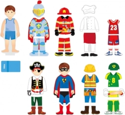 Ta magnetni oblačilni komplet otrokom prinaša neskončne možnosti kombiniranja pričesk, pokrival in oblačil. Magnetna figurica dečka stoji na stabilni osnovi, zato je rokovanje udobno, preoblačenje pa intuitivno in zabavno.