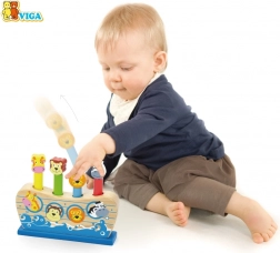 Stabilna lesena osnova v obliki ladje in štiri lesene paličke z živalcami (žirafa, opička, lev, zebra) ustvarjajo varno in vzdržljivo igralno okolje. Estetska embalaža je primerna kot idealno darilo za malčke in predšolske otroke.