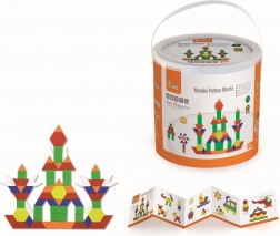 Veliko število ploščatih lesenih kock v različnih oblikah in barvah spodbuja domišljijo in razvoj prostorske predstave. Otroci lahko sestavljajo vzorce, živalice in celotne slike.