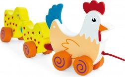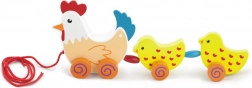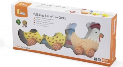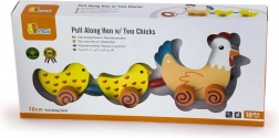 Ta lesena vlečna igrača povezuje kokoš in dva piščančka z rdečo vrvico. Med piščančki so nameščene barvite kroglice, ki med gibanjem pritegnejo otrokovo pozornost z vidnimi in zvočnimi učinki. Pri vlečenju se vsa vesela »družinica« prikupno ziblje in otroke motivira k hoji.