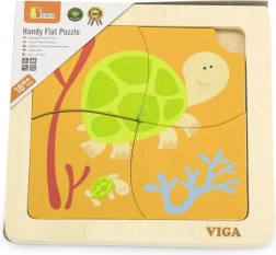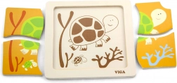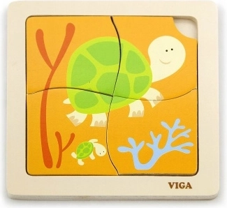 Lesena sestavljanka z želvico je zasnovana za otroke od 18 mesecev. Sestavljena je iz štirih velikih koščkov, ki jih je mogoče zlahka vstaviti v lesen okvir ali sestavljati samostojno. Vsak košček je barvito razgiban in ponuja edinstven način za razvoj otrokove prostorske domišljije in koordinacije oko–roka.