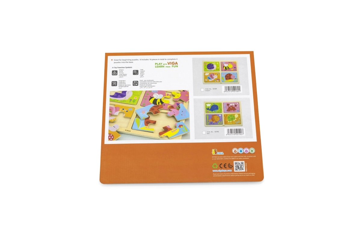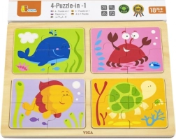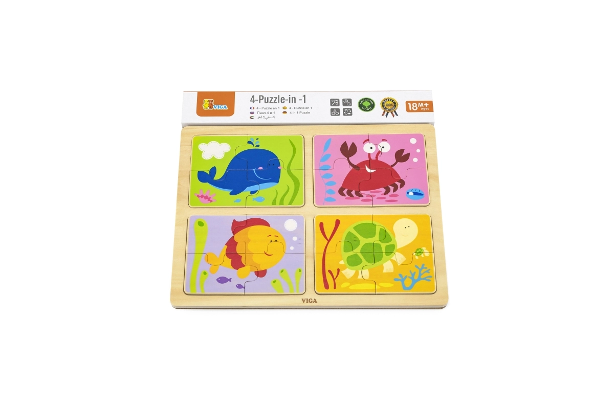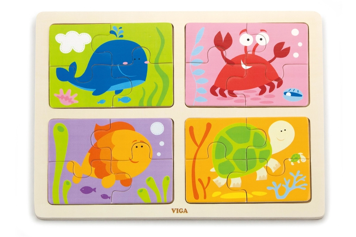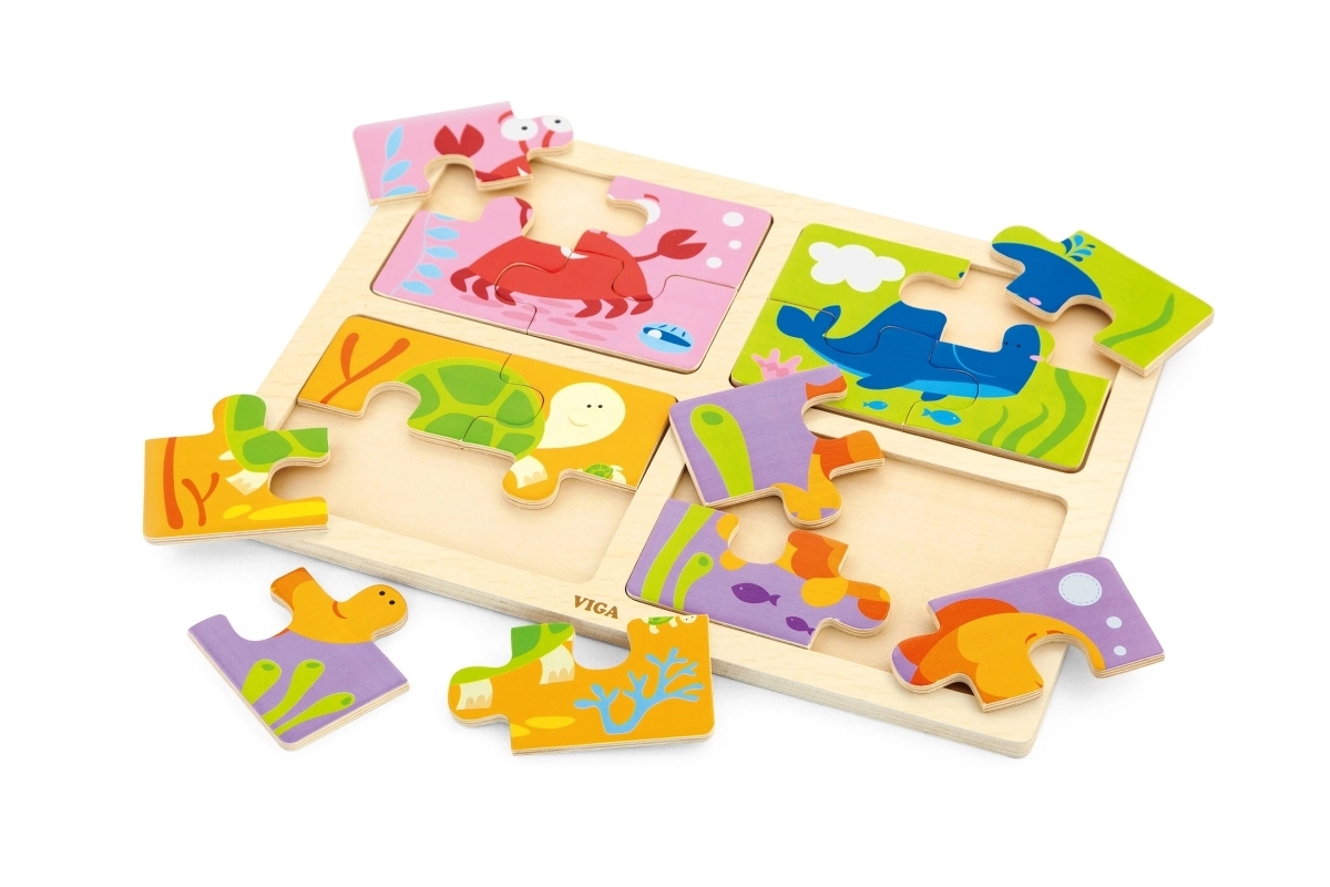 Ta set vsebuje štiri preproste lesene sestavljanke s simpatičnimi motivi morskih živali. Zaradi manjšega števila koščkov so idealne za prvo spoznavanje otrok s sestavljanjem, razvijajo koordinacijo oko–roka in učijo potrpežljivosti.