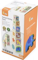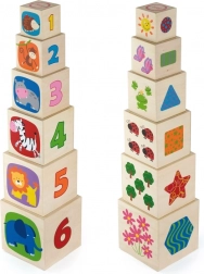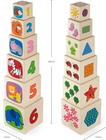 Set vsebuje 6 čvrstih lesenih kock različnih velikosti, iz katerih otroci zgradijo stabilen stolp ali jih zložijo eno v drugo. Bogate ilustracije z živalmi, barvami, oblikami in številčnimi elementi podpirajo zgodnje učenje in širijo besedišče.