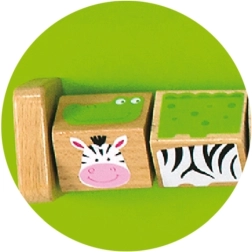 Tri prizme z ilustracijami živali otroci obračajo in sestavljajo v pravilno sliko – vadijo logiko, potrpežljivost in vizualno zaznavanje.