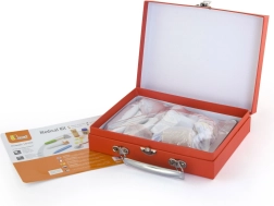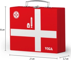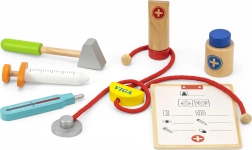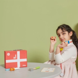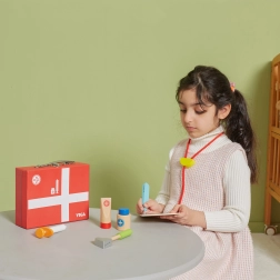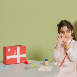 Ta čudovit zdravniški komplet v trdnem lesenem kovčku bo razveselil vse male zdravnike in zdravnice. Otroci lahko s stetoskopom poslušajo srček, “merijo” temperaturo s termometrom, dajejo injekcije ali izpolnijo karton pacienta za plišaste igrače in punčke. Igra zdravnika je zabavna igra vlog, ki razvija socialne veščine, občutljivost in empatijo.
