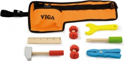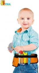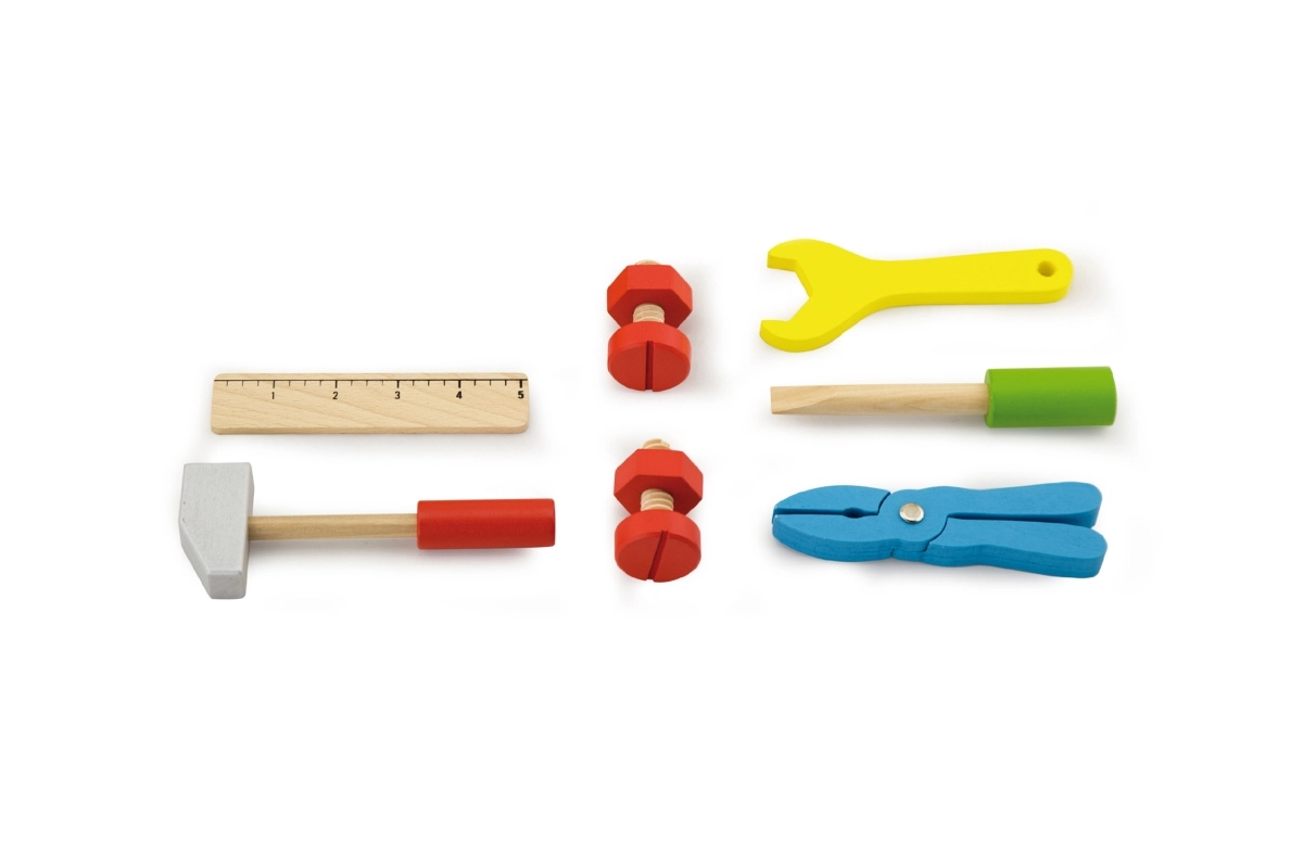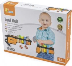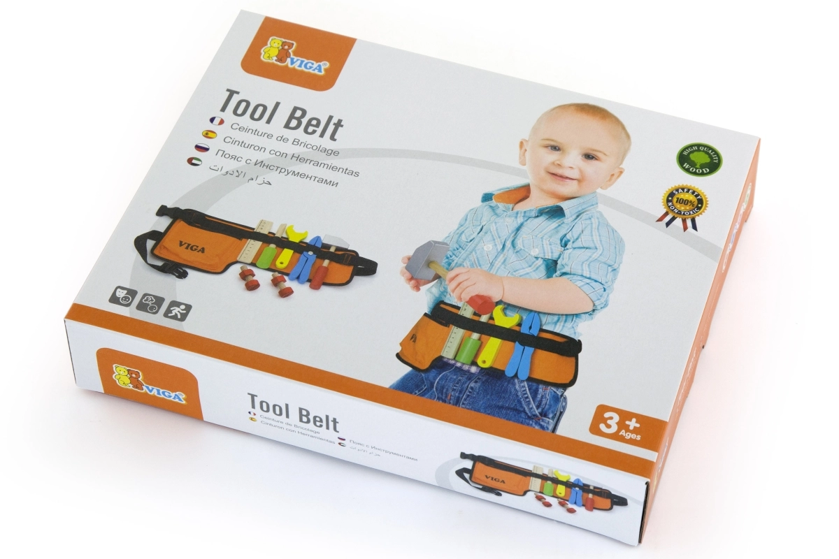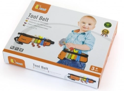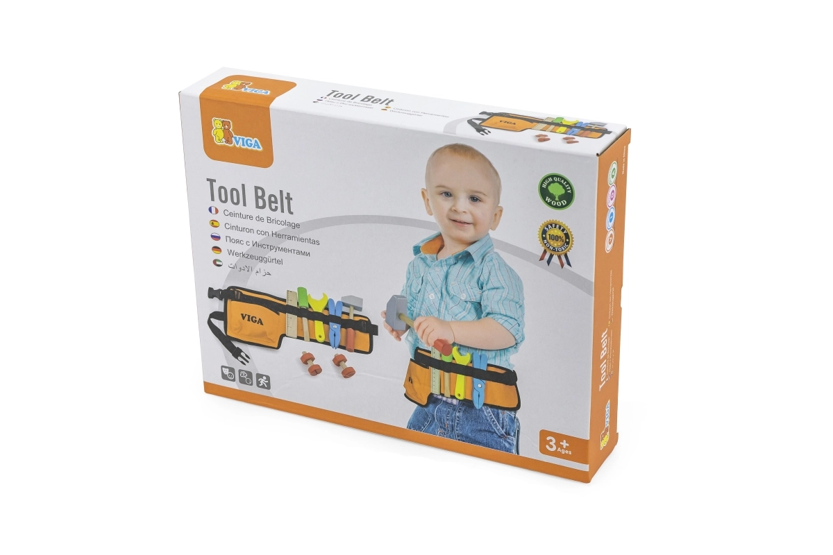 Pas z lesenim orodjem (vsebuje kladivce, ključ, izvijač, meter, vijake in matice, klešče). Mere pasu približno 36 × 18 × 2,5 cm. Mere embalaže približno 27 × 21 × 5 cm. Starost 3+.