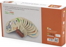 Set lesenih kartic, povezanih z rdečo vrvico, vsebuje različne slike, črke in poimenovanja elementov v angleščini na vsaki kartici. Ta igrača uči otroke črk, razvija motorične spretnosti in ponuja prva angleška besedila.