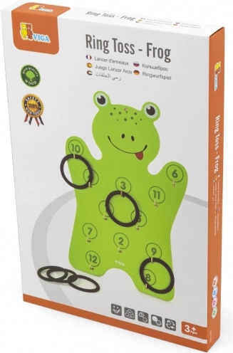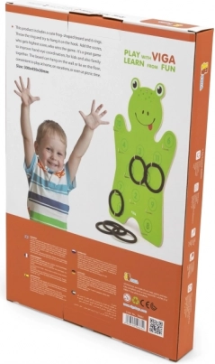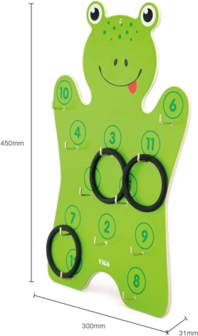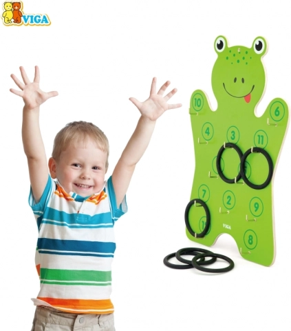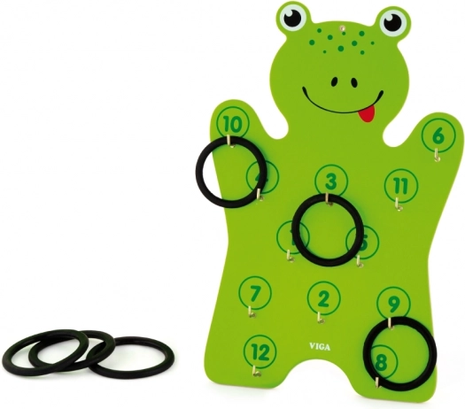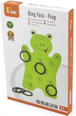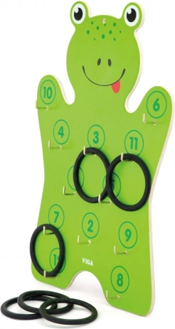 Lesena igra metanja obročev v obliki žabe. Razvija koordinacijo in natančnost, vsebuje 6 obročev. Idealno za otroke 3+. Kakovosten les, preprosta pravila.