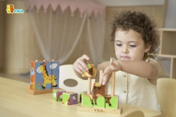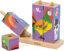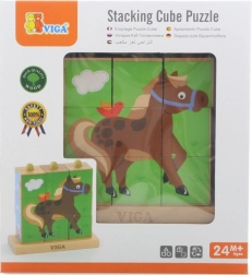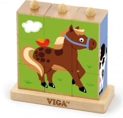 Lesene natakljive kocke VIGA z motivi domačih živali ponujajo zabavno sestavljanje 4 slik iz 9 kock na trdni osnovi iz bukovega lesa. Nagibni količki olajšajo obračanje kock in spodbujajo razvoj fine motorike, logičnega mišljenja ter potrpežljivosti. Primerno od 24 mesecev.