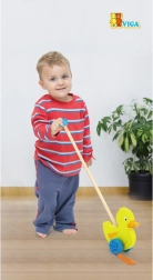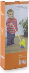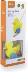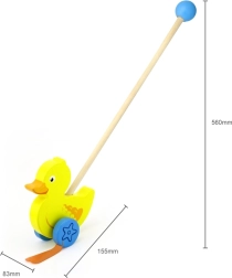 Leseni potisni raček na palici je preprosta, a učinkovita igrača, ki bo všeč vsakemu otroku. Gre za klasično igračo, ki prinaša številne prednosti. Prisrčen rumen raček ob premikanju energično premika nožice, kar otroke motivira k sprehodom. Igrača je pakirana v estetski škatli z okencem, ki omogoča pogled na račkico. V notranjosti je palica z ročajem, ki popolno sede v majhno otroško roko. Palica ni trajno pritrjena, kar olajša shranjevanje. Celotna igrača je izdelana iz bukovega lesa in premazana z nestrupenimi barvami v živih odtenkih, ki pritegnejo pozornost in spodbujajo k igri, kar prinaša veliko veselja.