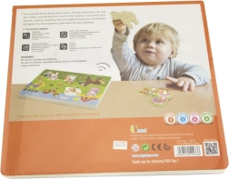 Lesena vstavljanka z živalmi, z zvokom. Ko pravilno vstaviš žival, se oglasi zvok, ki ga žival oddaja. Dimenzije plošče približno 30 x 22,5 x 2 cm. Napajanje 2 x AAA bateriji (nista priloženi). Dimenzije embalaže približno 30 x 27 x 2 cm. Starost 18m+