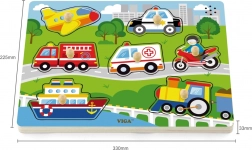 Sestavljanka vsebuje naslednja prevozna sredstva: letalo, avto, reševalno vozilo, ladja, gasilski tovornjak, motocikel in helikopter. Pri igri se hitro izboljšujeta otrokov opazovanje in spomin. Priporočeno za otroke od 18 mesecev.