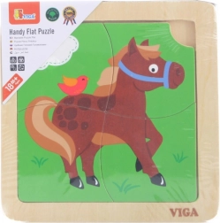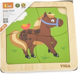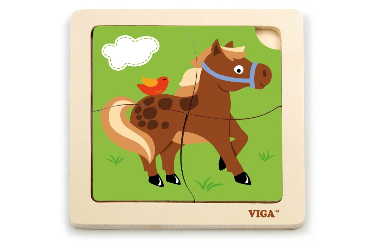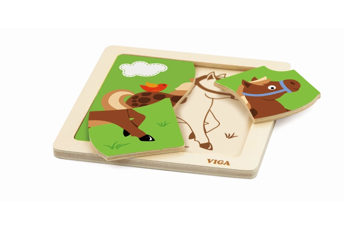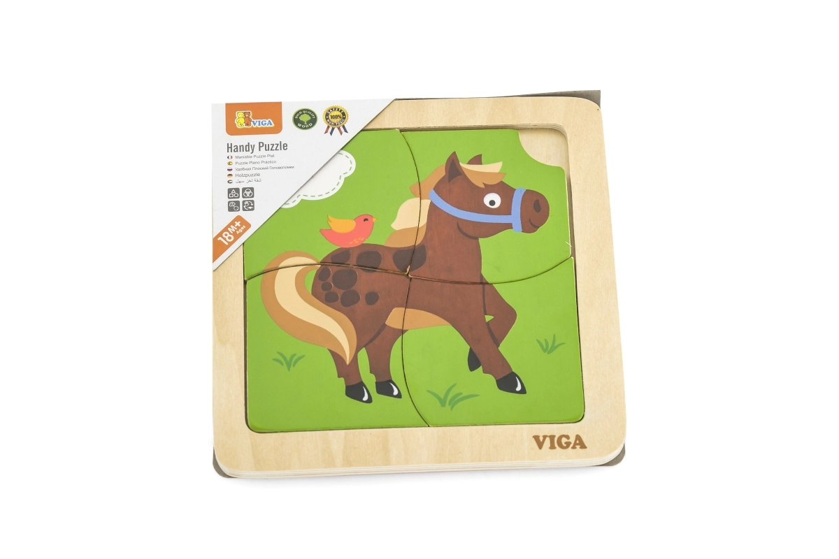 Ta kompaktna lesena sestavljanka z veselým konjičkom je idealna prva uganka za malčke. Veliki in gladki koščki se udobno držijo v malih rokicah in vstavijo v stabilen lesen okvir, ki olajša pravilno umeščanje.