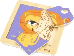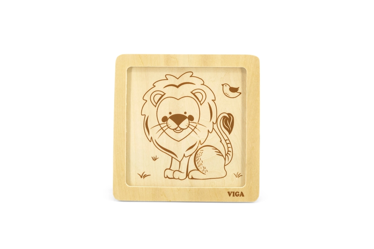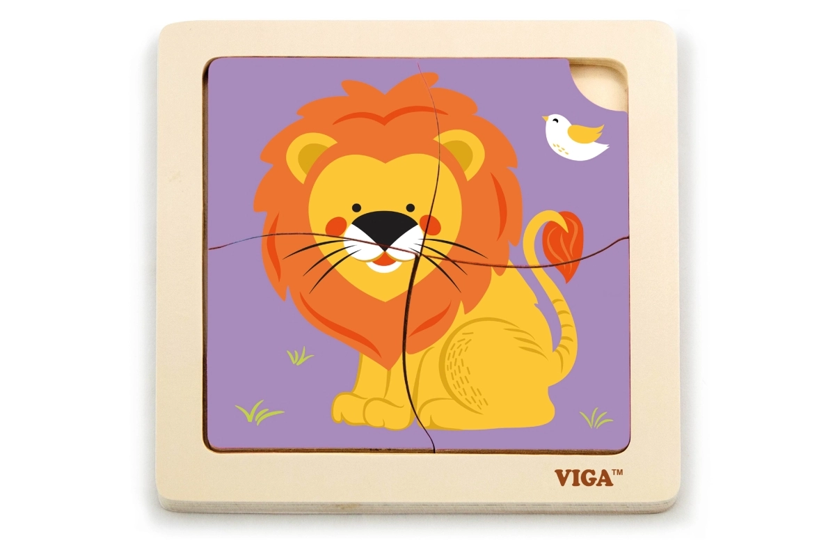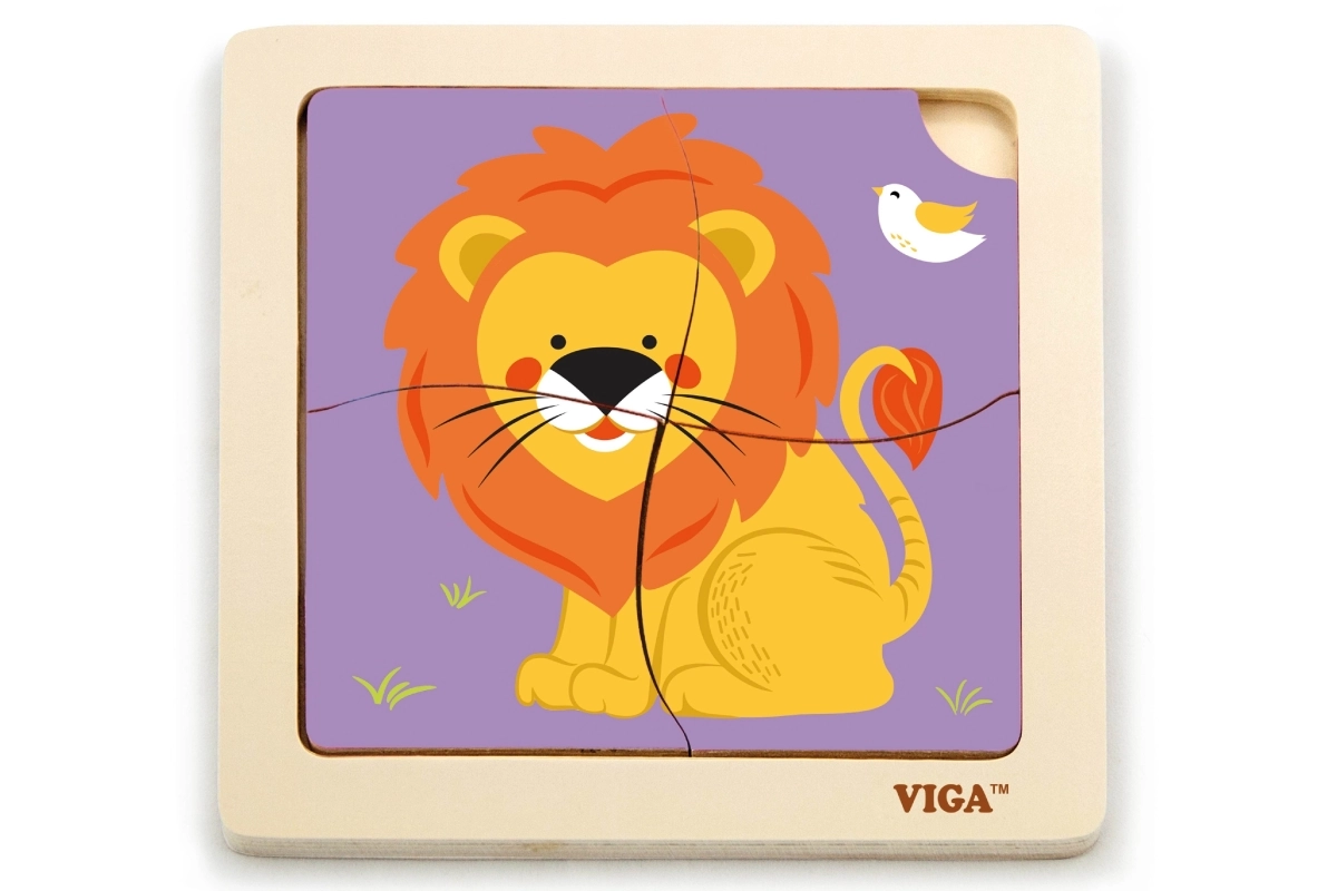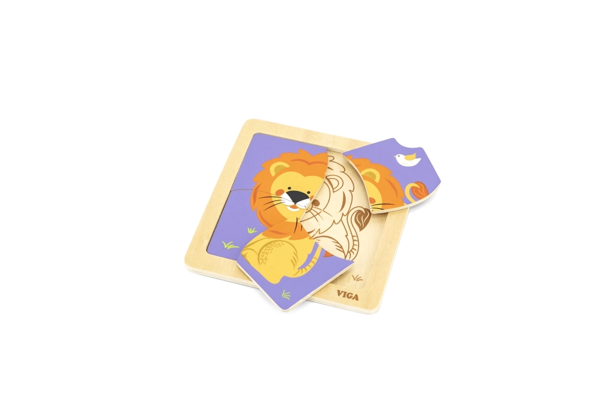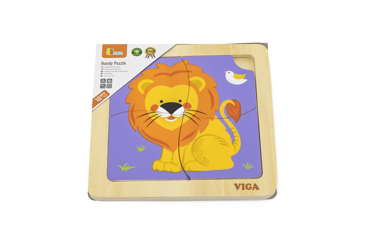 Ta kakovostna lesena sestavljanka z veselo podobo leva je zasnovana za majhne rokice. Zahvaljujoč štirim robustnim delom z gladkimi robovi se otroci zlahka učijo prepoznavati oblike ter urijo potrpežljivost in zbranost. Praktična lesena osnova drži dele na mestu in olajša sestavljanje.