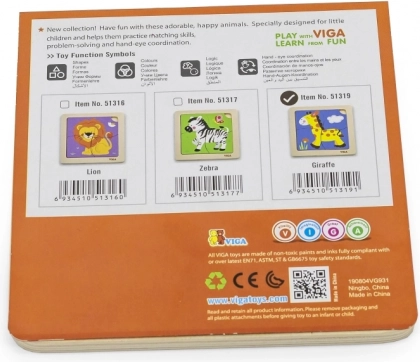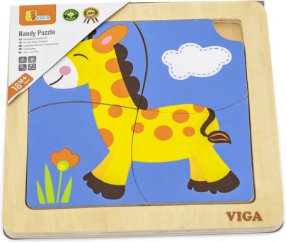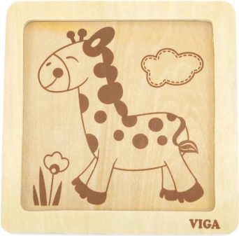 Lesena sestavljanka znamke Viga za otroke od 12 mesecev je idealna igrača tako za dom kot za vrtec. Vsebuje štiri tematske dele in osnovno ploščo, na kateri lahko otroci po risbi sestavijo sliko. Varne barve in naravni materiali zagotavljajo varnost in zabavo.