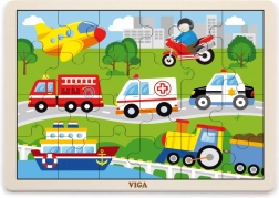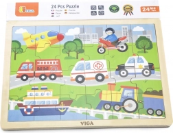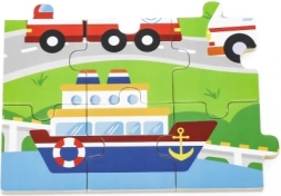 Ta lesena sestavljanka z motivi prevoznih sredstev je odlična izbira za prve “večje” puzzle. S 24 kosi je sestavljanje ravno pravšen izziv – podpira zbranost in veselje ob dokončani sliki v velikosti približno 27,5 × 20 cm. Barvite ilustracije vozil (reševalno vozilo, gasilski avto, policijsko vozilo, ladja, letalo ipd.) otroke naravno motivirajo k ponavljajoči igri.