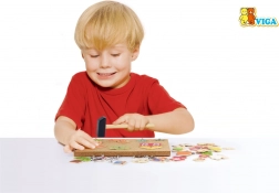 Pribijanje koščkov s kladivcem vadi koordinacijo oko–roka, zbranost in logično razmišljanje v duhu Montessori načel.