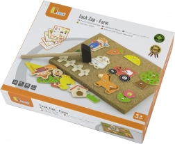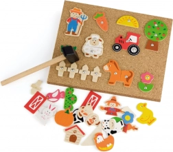 Barvne lesene oblike se s pomočjo žebljičkov pritrjujejo na trdno korkasto tablo – otroci po domišljiji sestavljajo živalice, traktor in kmeta.
