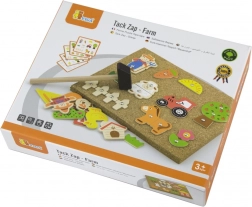 Ta lesena Montessori igrača podpira samostojno raziskovanje in koncentracijo. Koščke s predvrtanimi luknjicami je preprosto pritrditi na trdno korkasto tablo z žebljički, zato lahko otroci vedno znova sestavljajo traktorje, živalice in kmete.