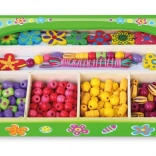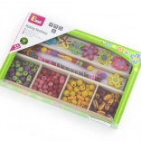 Barvite perlice različnih oblik, vključno z rožicami, spodbujajo domišljijo in vizualno zaznavo pri sestavljanju lastnih vzorcev.