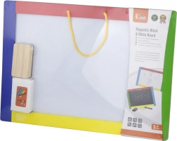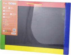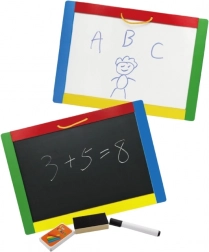 Ta univerzalna tabla združuje dve ustvarjalni površini v eni – črno magnetno stran za krede in belo suhobrisno stran za marker. Otroci lahko pišejo, rišejo in vadijo črke ter številke; na črni strani lahko poleg tega zlahka pritrdijo magnetke. V paketu je vse za takojšnjo uporabo: 4 krede, suhobrisni marker in gobica.