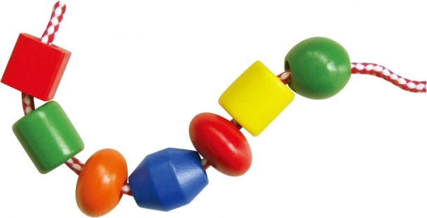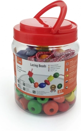 Plastična škatla vsebuje velike lesene kroglice in barvne vezalke, na katere lahko nizate kroglice. Velikost kroglice približno 2 x 2 cm, odvisno od vrste. Dimenzije pakiranja približno 16 x 12 cm. Vsebuje 90 kroglic in 5 vrvic. Starost 3+.