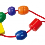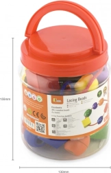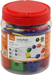 Velike lesene kroglice v priročni škatli z barvnimi vezalkami bodo razveselile vsakega otroka od 3. leta dalje. Zaradi ekstra velikosti jih je enostavno prijeti in varno navlačiti, kar spodbuja fino motoriko, koordinacijo oko–roka ter prepoznavanje barv in oblik. V pakiranju je 30 kroglic in 4 vrvice za neskončno ustvarjanje.