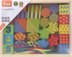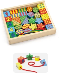 Ta lesena nizalka otrokom ponuja neskončne možnosti ustvarjanja: nizanje kot kroglice, gradnja stolpov in hišk ter razvrščanje po barvah in oblikah. Veliki deli (pribl. 4 cm) so enostavni za držanje in idealni za prve motorične vaje.