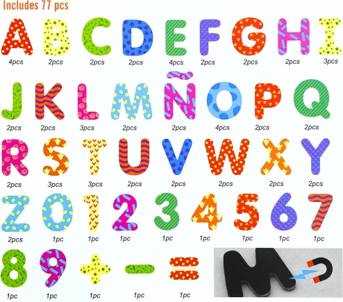 Vsak košček je trden, prijeten na otip in se dobro oprime običajnih magnetnih površin. Zahvaljujoč priročni embalaži vsi deli ostanejo skupaj in pripravljeni za naslednjo igro. Otroci na igriv način vadijo abecedo, barve, štetje in logično mišljenje.