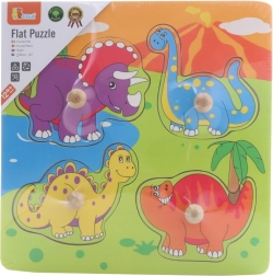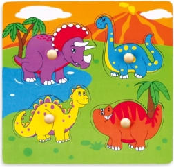 Ta lesena vstavljanka z motivom pisanih dinozavrov je idealen pripomoček za razvoj otroške domišljije in fine motorike. Sestavljena je iz podlage in štirih različnih oblik dinozavrov z lesenimi držali za lahko vstavljanje.